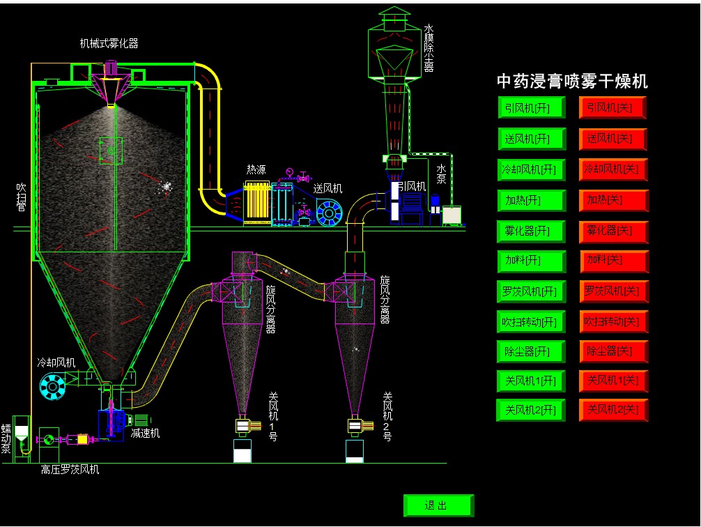 该机采用全封闭形式,所有部件均采用不锈钢制造,配有三级净化装置,过滤后的空气达十万级要求。筒体与顶部装有冷壁装置,使壁温<80℃,干燥塔内装有气刷扫塔装置。经该机干燥后的中药浸膏粉,不会出现焦化变质现象,大大增加了收粉率(95%以上),而且不会产生混药现象和粘壁现象。