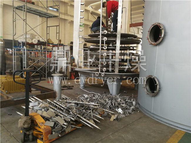 湿物料自加料器连续地加到干燥器上部第一层干燥盘上,带有耙叶的耙臂作回转运动使耙臂作回转运动使耙叶连续地翻抄物料。物料沿指数螺旋线流过干燥盘表面,在小干燥盘上的物料被移送到外缘,并在外缘落到下方的大干燥盘外缘,在大干盘上物料向里移动并从中间落料口落如下一层小干燥盘中。大小干燥盘上下交替排列,物料得以连续地流过整个干燥器。中空的干燥盘内通入加热介质,加热介质形式有饱和蒸汽、热水和导热油,加热介质由干燥盘的一端进入,从另一端导出。已干物料从底层干燥盘落到壳体的底层,而后被耙叶移送到出料口排出。湿份从物料中逸出,由设在顶盖上的排湿口排出,真空型盘式干燥器的湿气由设在顶盖上的真空泵口排出。从底层排出的干物料可直接包装。通过配加翅片加热器、溶剂回收冷凝器、袋式除尘器、干料返混机构、引风机等辅机,可提高其干燥的生产能力,干燥膏糊状和热敏性物 料,可方便地回收溶剂,并能进行热解和反应操作。