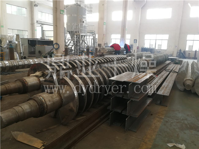 在浆叶及夹套通入蒸汽加热的同时,出料口上部同时通入经过加热后的干空气进一步干燥,这样大大增加了设备的干燥强度。蒸发出来的水分由尾气带出干燥机,经过布袋除尘器过滤,将干燥后的细粉回收下来,湿空气由水除尘后引风机排出室外。
