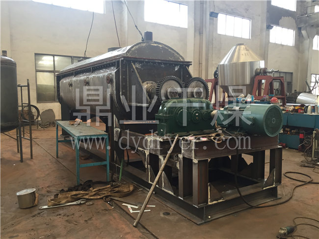 在浆叶及夹套通入蒸汽加热的同时,出料口上部同时通入经过加热后的干空气进一步干燥,这样大大增加了设备的干燥强度。蒸发出来的水分由尾气带出干燥机,经过布袋除尘器过滤,将干燥后的细粉回收下来,湿空气由水除尘后引风机排出室外。